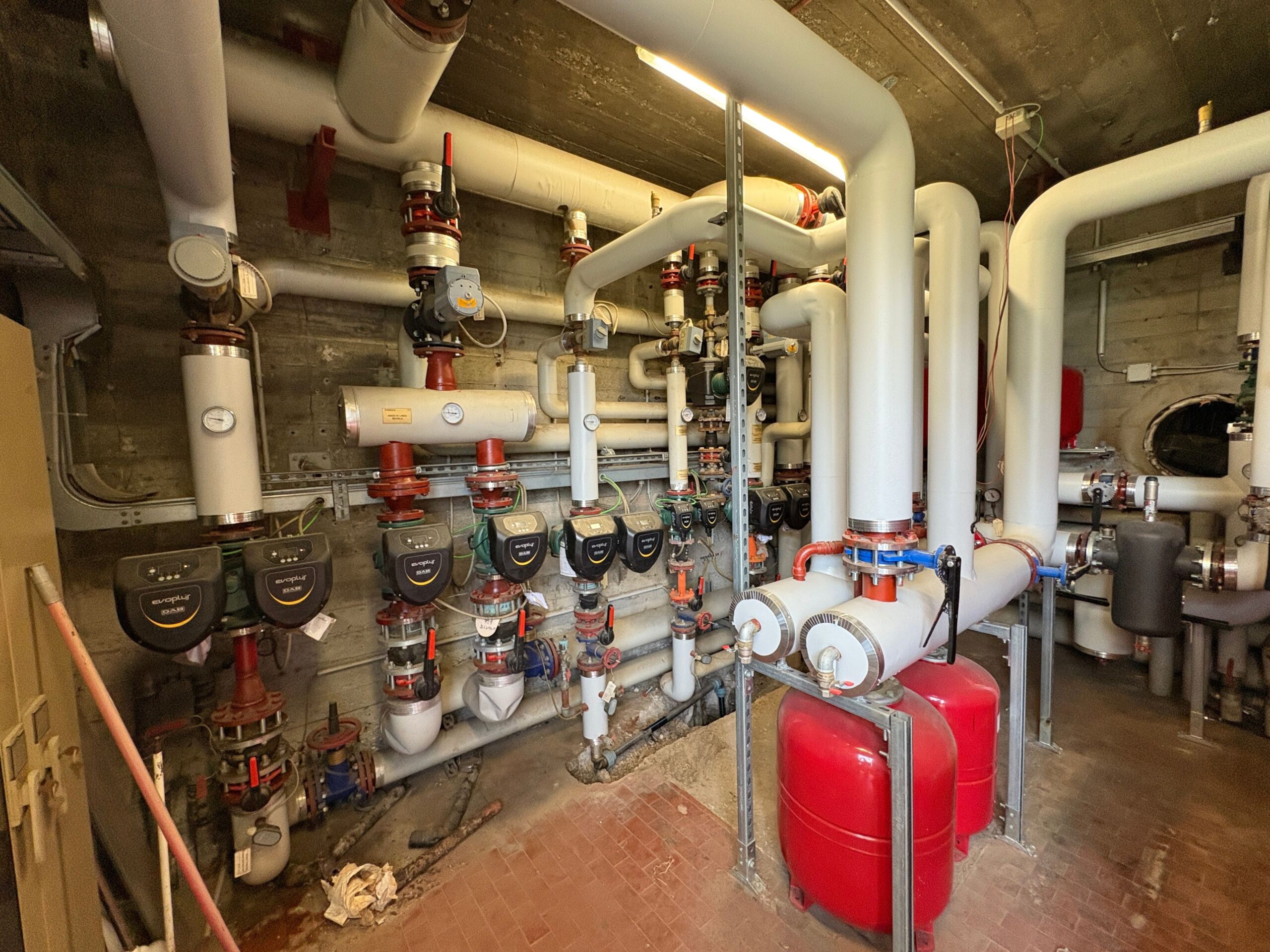 La centrale termica originaria è stata mantenuta per servire un secondo sistema di generazione dedicato alla palestra (edificio non oggetto di intervento) e comprende tutti i circuiti di riscaldamento, suddivisi in zone termiche e dotati di circolatori inverter e valvole miscelatrici. Questi consentono di regolare la temperatura di mandata del fluido termovettore in funzione delle condizioni climatiche esterne e interne.