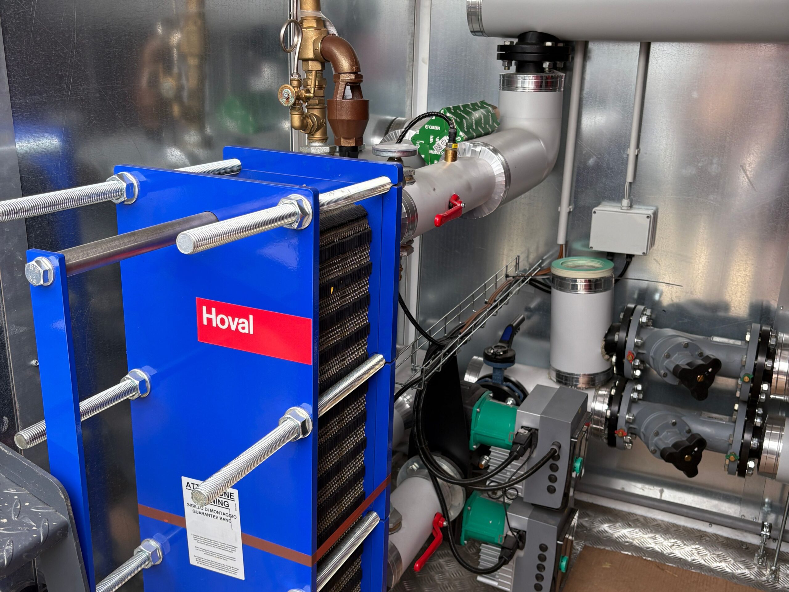 La generazione esistente, precedentemente costituita da una caldaia tradizionale a basamento, è stata sostituita con un nuovo sistema ibrido composto da una pompa di calore aria-acqua Climaveneta, affiancata da una caldaia a condensazione ad alta efficienza Hoval.